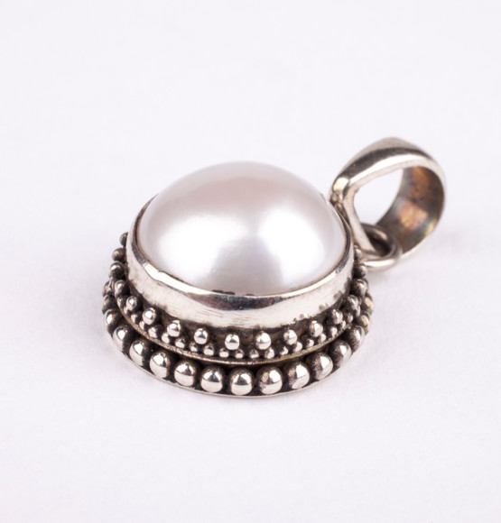 Aurora-kaulakoru pyöreä. Nana S design. Hopeaa ja helmijäljitelmä. Riipuksen pituus 3 cm ja ympyrän halkaisija 1,9 cm.